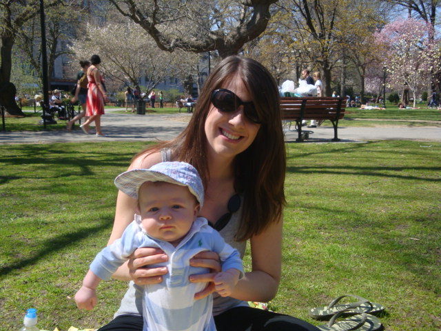We took Emmett for his second-ever stroll downtown through the Common and the Public Garden, where we stopped to have a little picnic in the park. This time, the Swan Boats were out, the tulips were in bloom and the sun was definitely an issue. We cut our outing a little short on account of the brutal rays, especially since sunblock for little ones seems to be only available for little ones 6 months and older. Still, we definitely had a grand ole time!